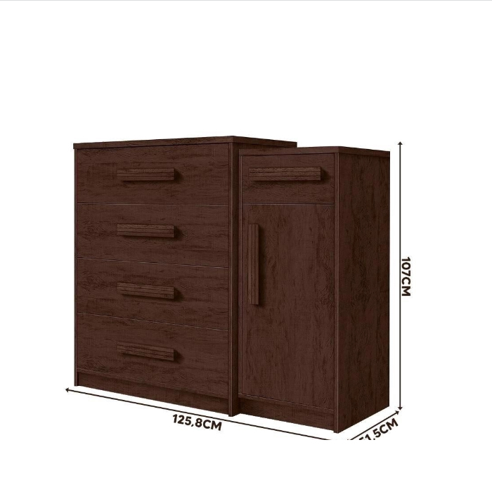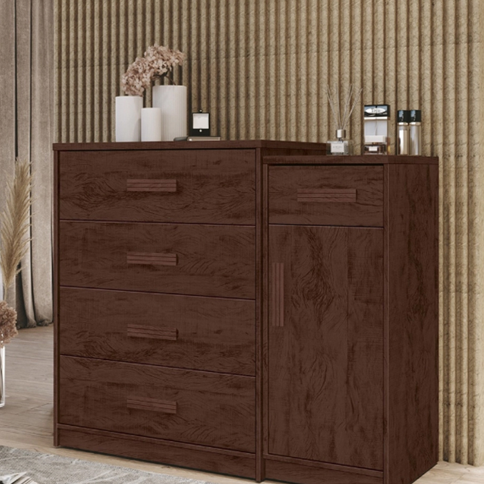 A Cômoda Elis conta com quatro amplas gavetas, uma menor, compartimento de sapateira com porta, reforços estruturais no fundo destas e seis rodízios para melhor deslocamento do móvel, algo bastante útil para a limpeza do ambiente onde ela estará posicionada. Conta com excelente acabamento e uma bela combinação de cores, sendo uma ótima pedida para o seu quarto.
