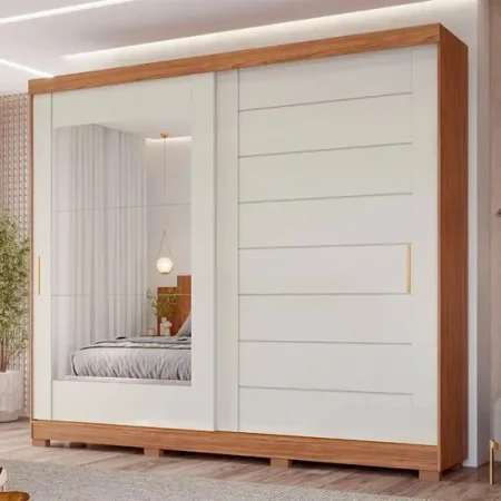 Com uma divisão interna bem completa com muitas gavetas, prateleiras e nichos, esse roupeiro deixará seu quarto super organizado.