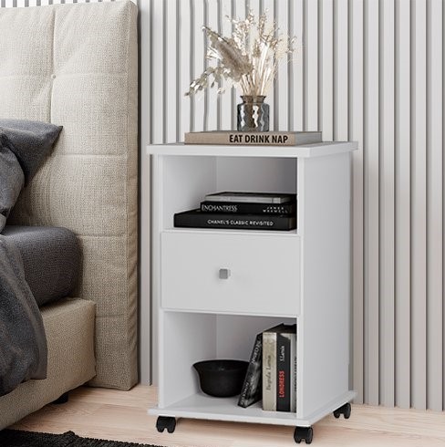 A mesa de cabeceira Otto é o item ideal para seu quarto. Tampo em MDP 25mm, 1 Gaveta, Corrediças metálicas, Pés rodízios.
